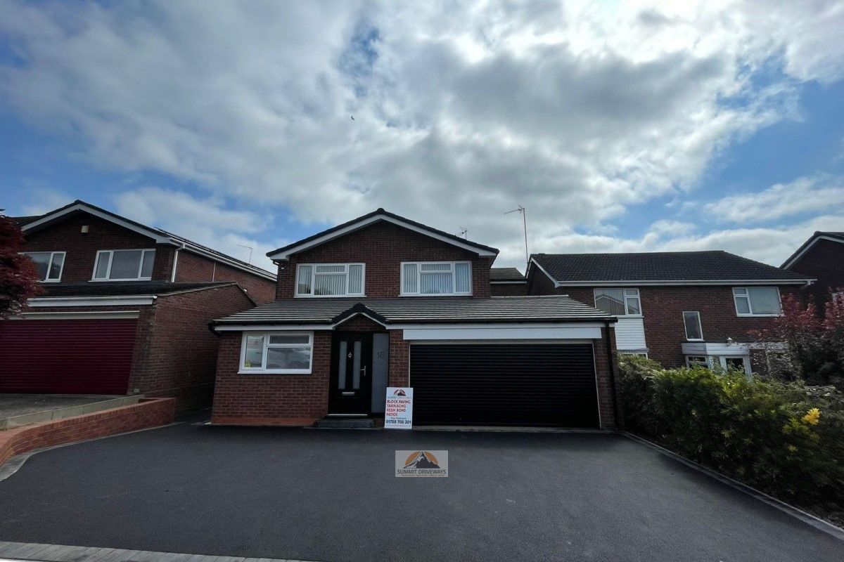 This driveway job took place in Rugby. We completely excavated the existing driveway, put in a new sub-base of MOT type 1 and compacted it to a solid finish. We installed an ACO channel drainage system and replaced existing manhole covers with recessed ones. We built a 9-inch double-skin curved wall acting as a retainer for a flowerbed. The driveway was framed with charcoal Marshall block paving bricks and laid with SMA grade tarmac, which we machine-rolled to a solid finish.